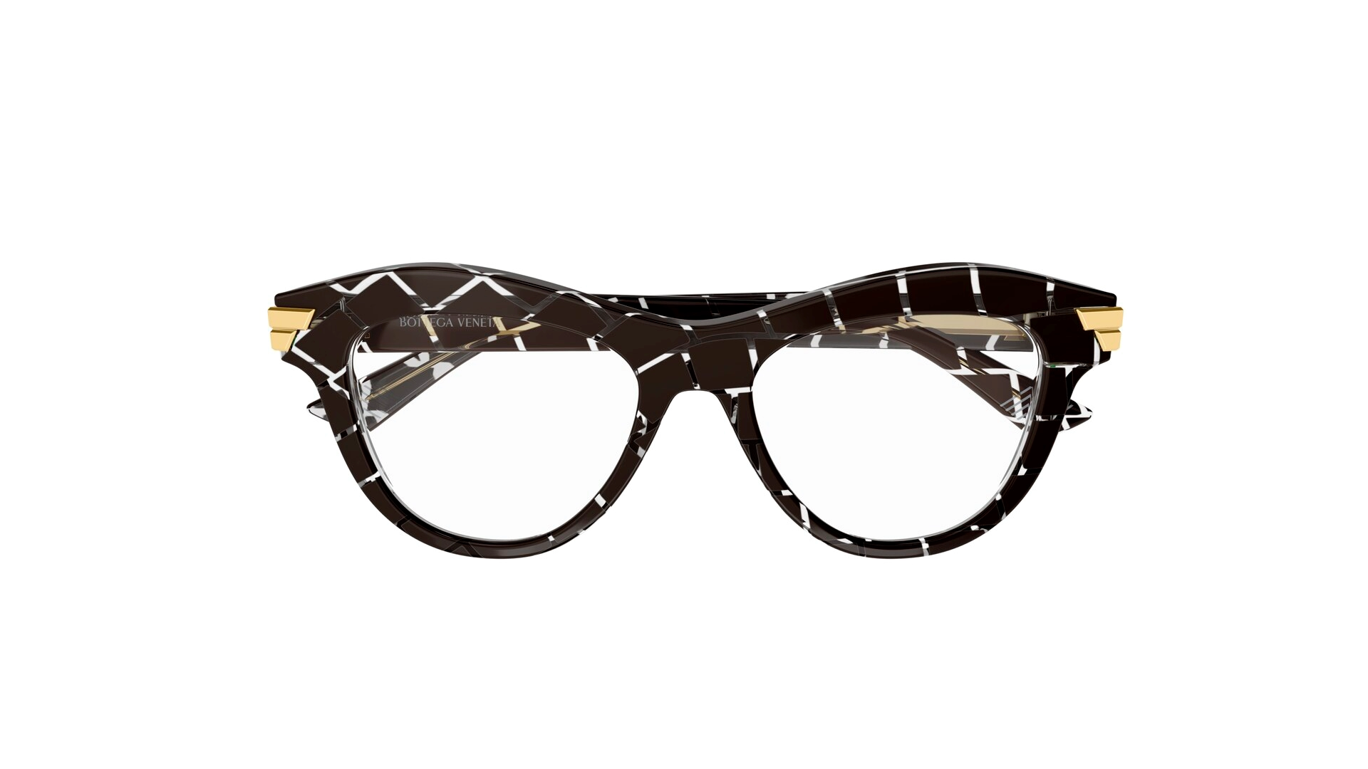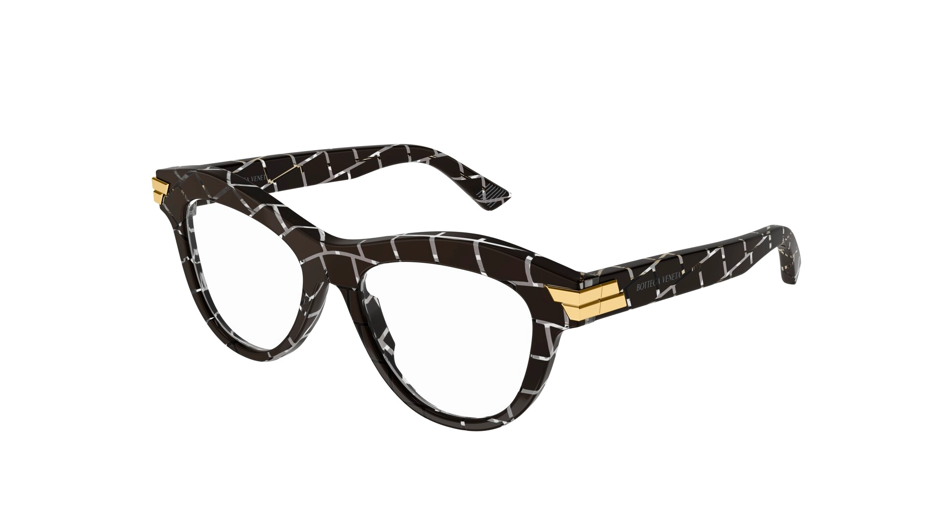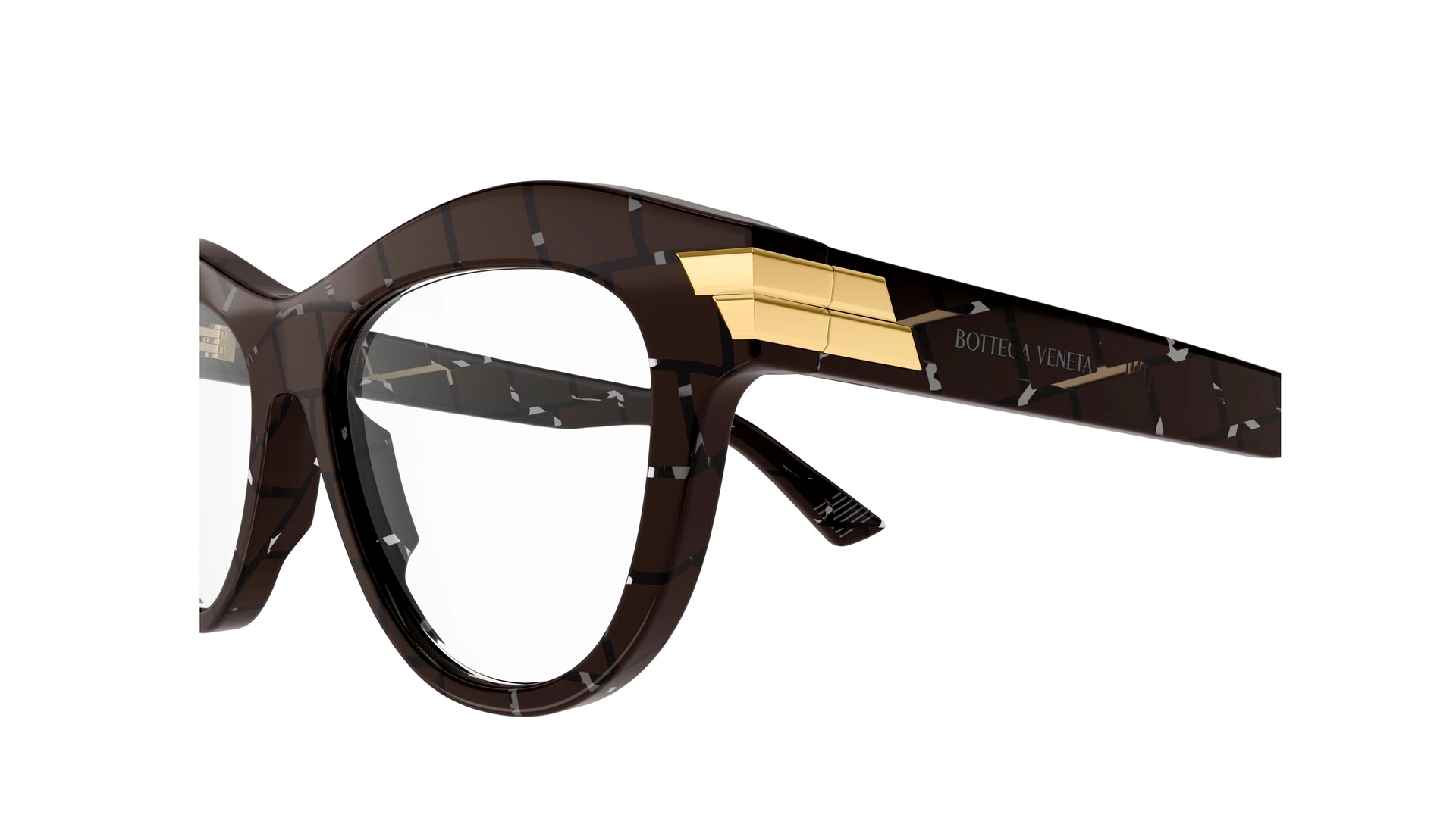 Modelo gatinho feminino inteiramente em acetato, caracterizado por volumes acentuados. Emblema fringed ribbon arrojado em metal, a realçar as hastes e charneiras. Logotipo Bottega Veneta gravado a laser na parte externa da haste esquerda.