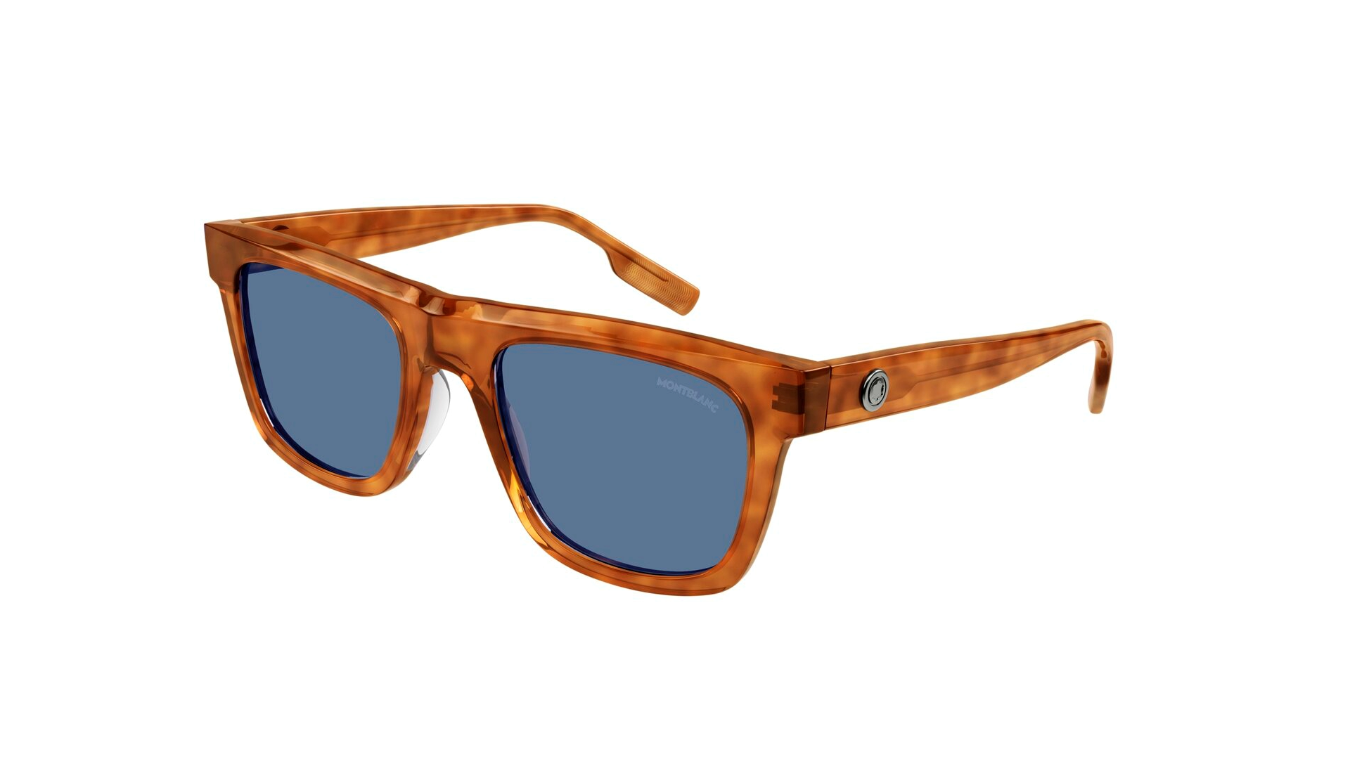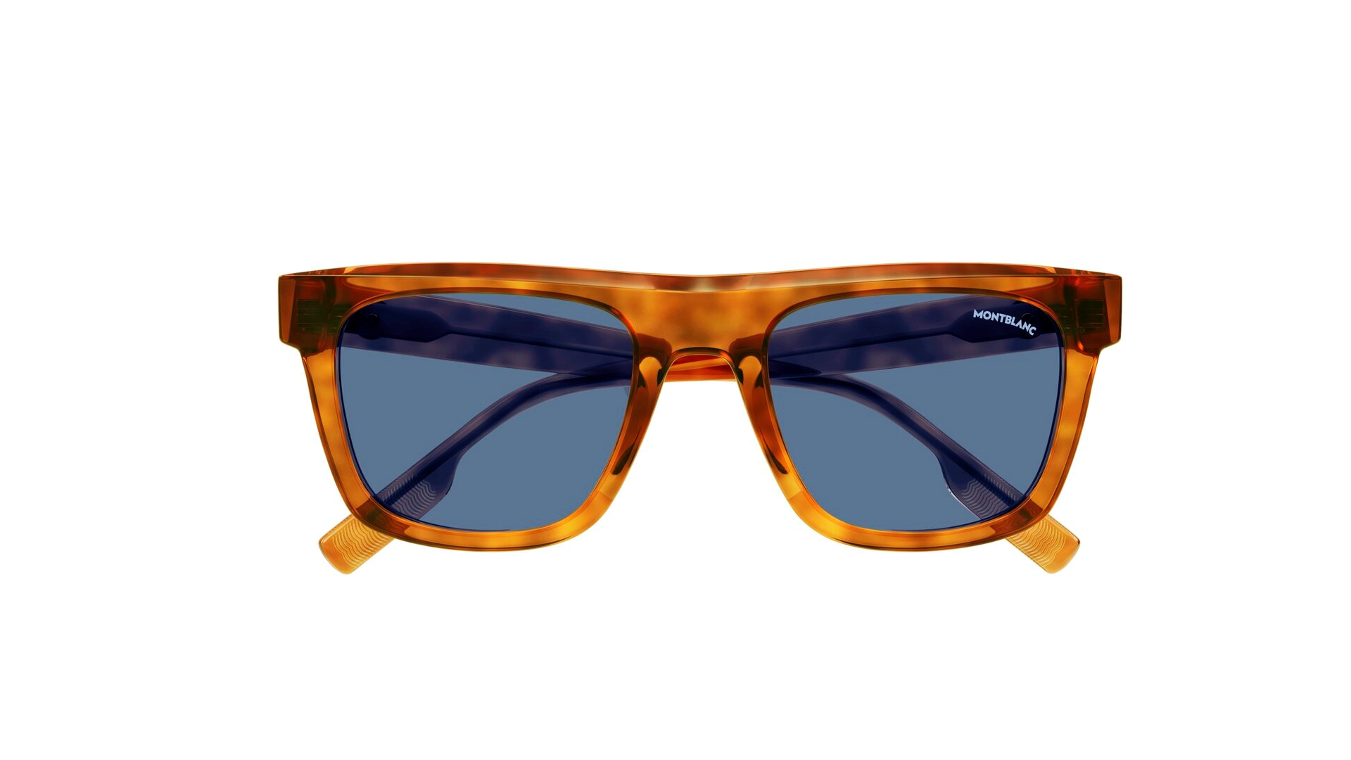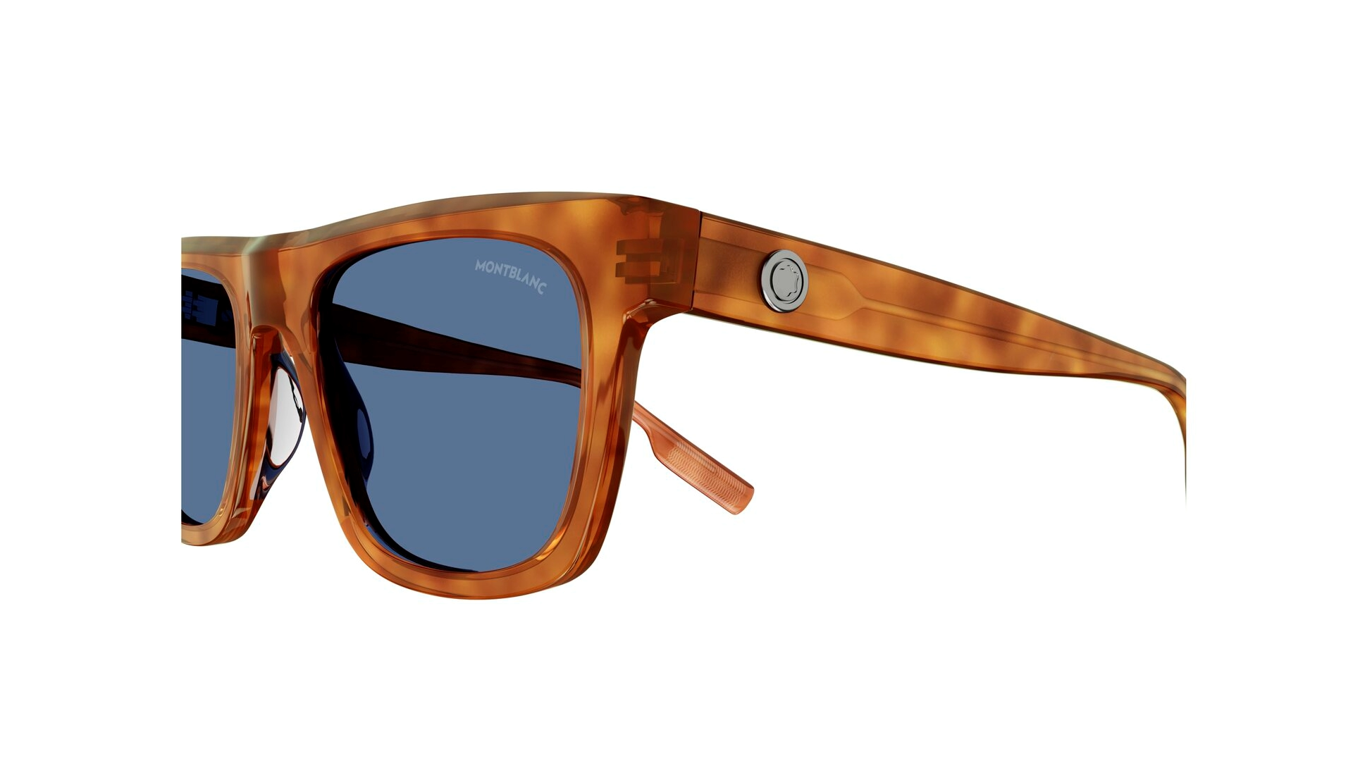 Formato retangular com barra superior em volumes de acetato robusto, adornado com um bisel leve na parte superior frontal. Logotipo escrito Montblanc gravado a laser na lente esquerda.