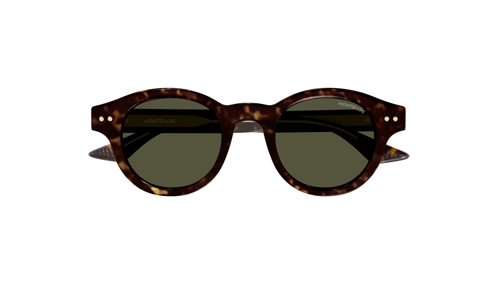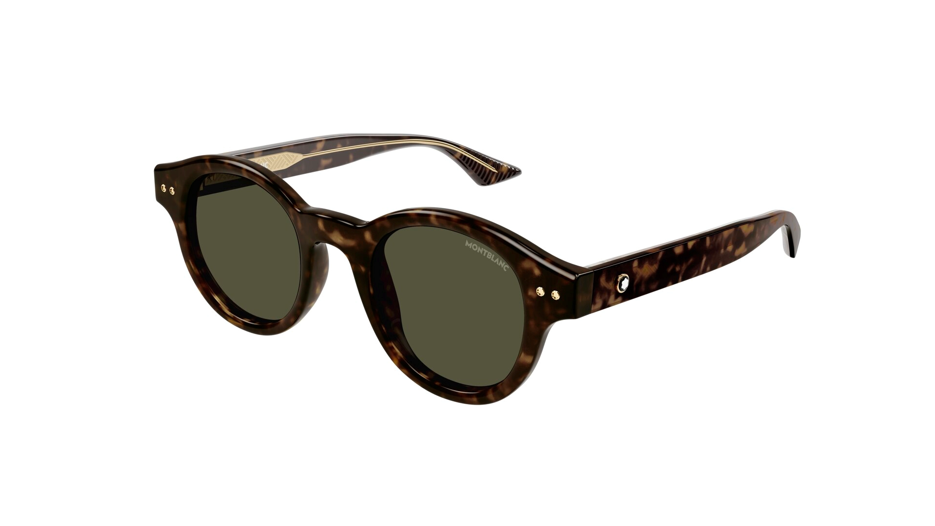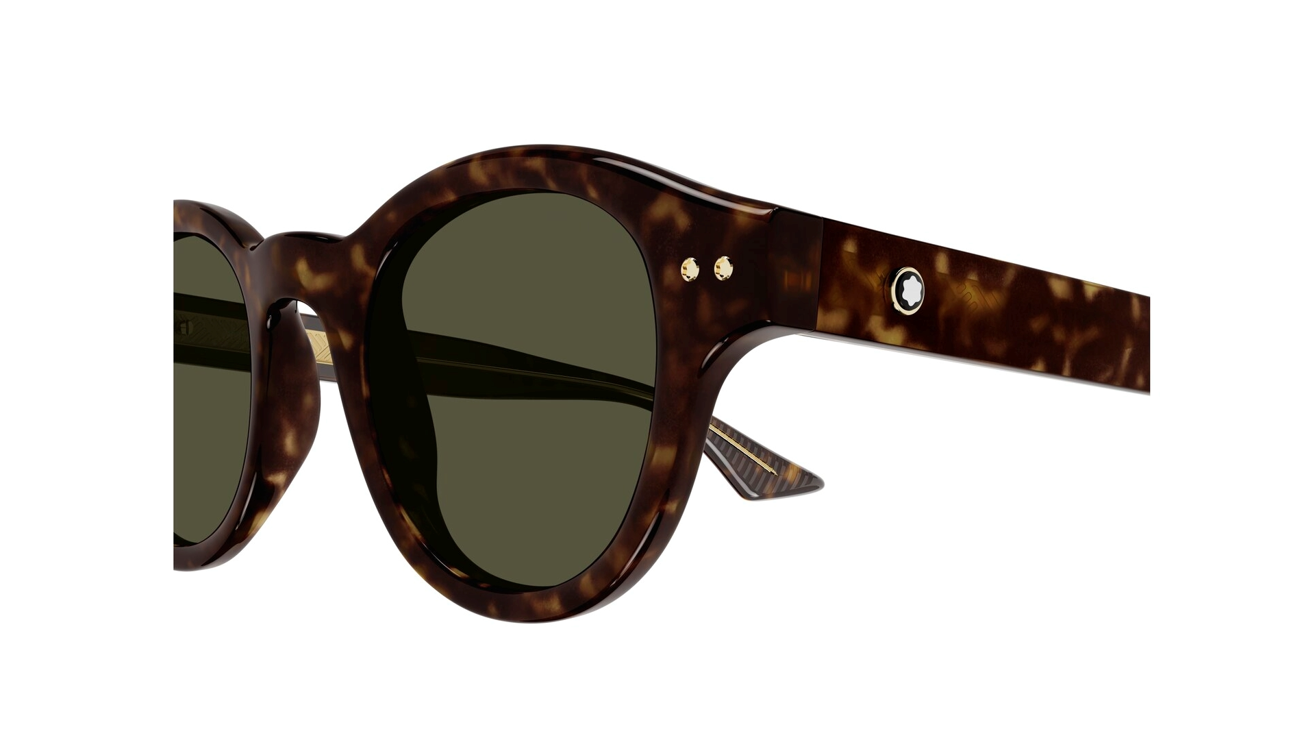 Formato redondo em acetato. Detalhes de metal Snowcap na frente, emblema Snowcap nas hastes rodeado por um aro de metal e fio central.