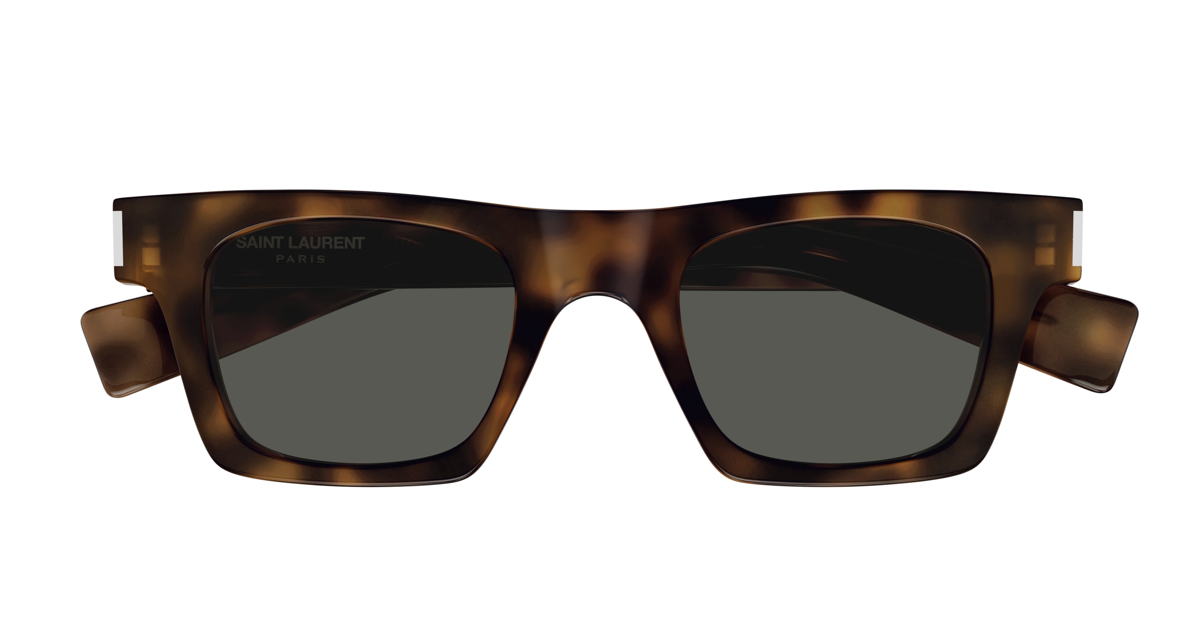 Formato quadrado em acetato, com o corner em metal. Logotipo gravado nas hastes.
